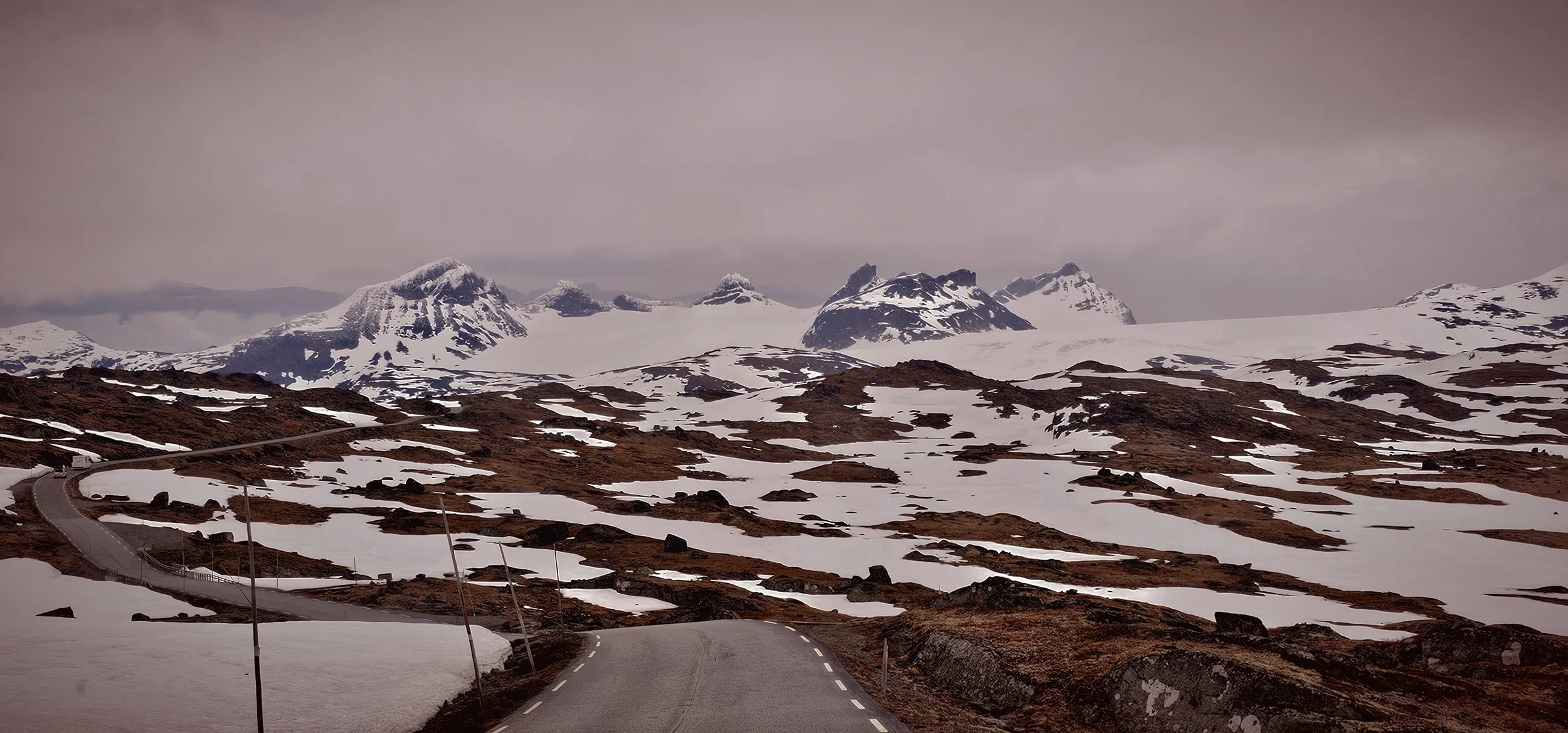 Roughly 2.5 hours into the drive and after climbing ~4k ft in altitude, you will reach the viewpoint called Nedre Oscarshaug, offering spectacular views of valleys, peaks, and a hairpin road. The rest area is named after a trip King Oscar II took over the mountain in 1860.