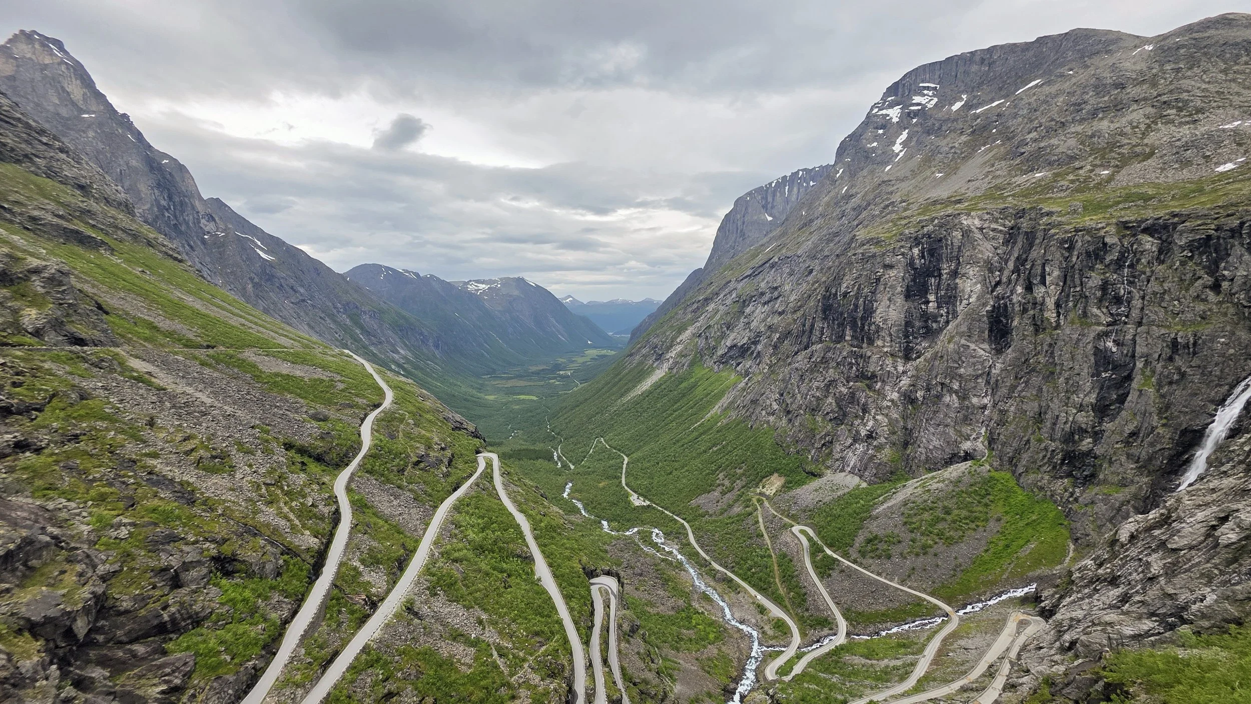 From Alesund, consider waking up very early and driving 2 hours east to the Trollstigen Pass (there are no ferries). Trollstigen is a famous, scenic mountain pass in Norway known as "The Troll's Ladder" that features 11 steep hairpin bends along a dramatic mountainside. It is a major tourist attraction and is known for its spectacular views, especially from the viewing platforms at the top, which overlook the road and the Stigfossen Waterfall. There is no fee to visit the platforms. Before making the drive to Trollstigen, you should also verify whether the road is open because it’s often closed due to falling rocks. That said, it’s still worth the visit even if it the road is closed and that’s because 1) the viewing platforms should still be open and 2) the drive to Trollstigen is a fun experience. This photo is from the platform furthest down the hill which is easy to find if you just keep walking.