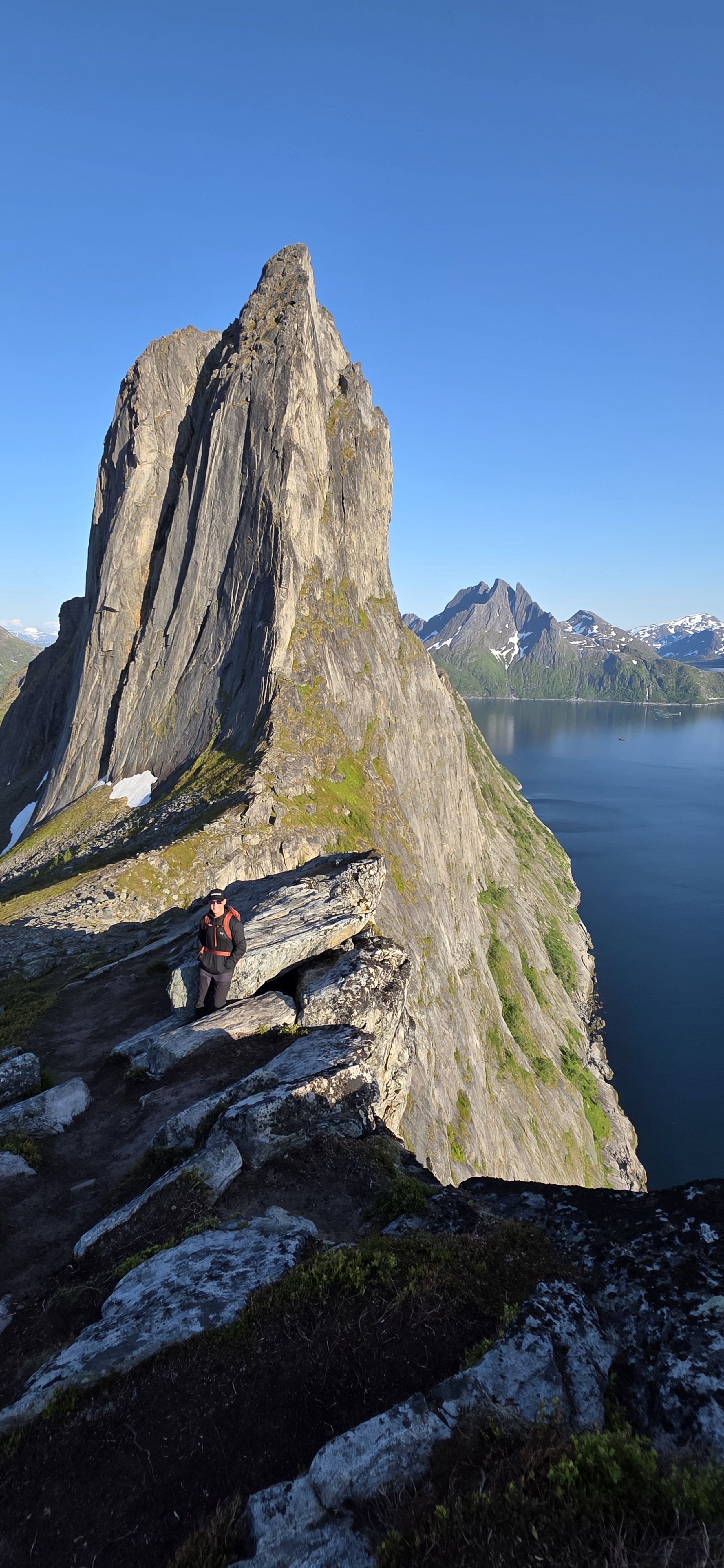 The path to Hesten is not signposted nor marked, but it is easy to follow once you find the trail head and because you can see others in front of you. It’s mostly uphill but it’s much less grueling than many of the hikes covered earlier in the blog. Once you reach the main area, there will be a lot of photo opportunities from different vantage points, especially if you continue climbing further up the ridge. Transparently, my brother wasn’t in the mood to take more risks, so our options were somewhat limited. The photo here was taken ~70% through the hike, but it’s farther than it looks to reach that final spot.