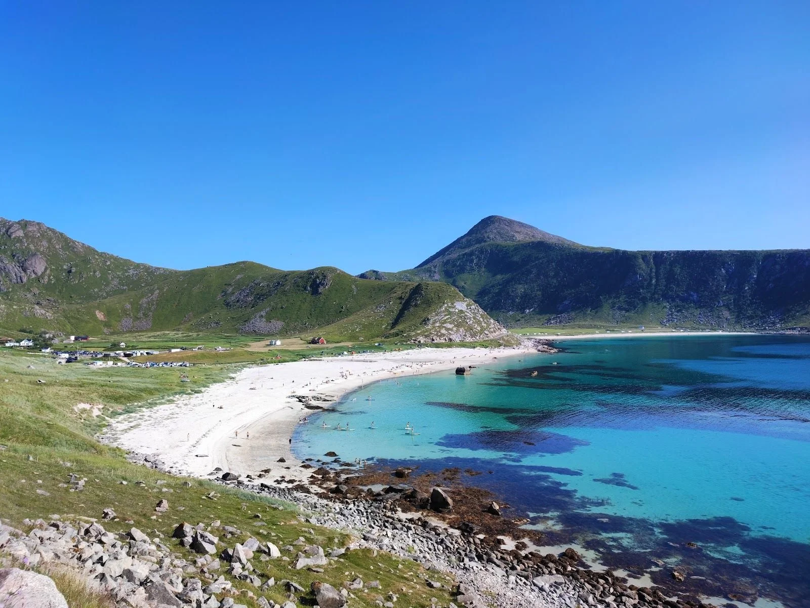 Just north of Leknes, turn right onto Leiteveien from highway E10. Follow the narrow road out to Haukland Beach. Most people would say that Uttakleiv Beach is prettier, but we both thought Haukland was more photogenic.