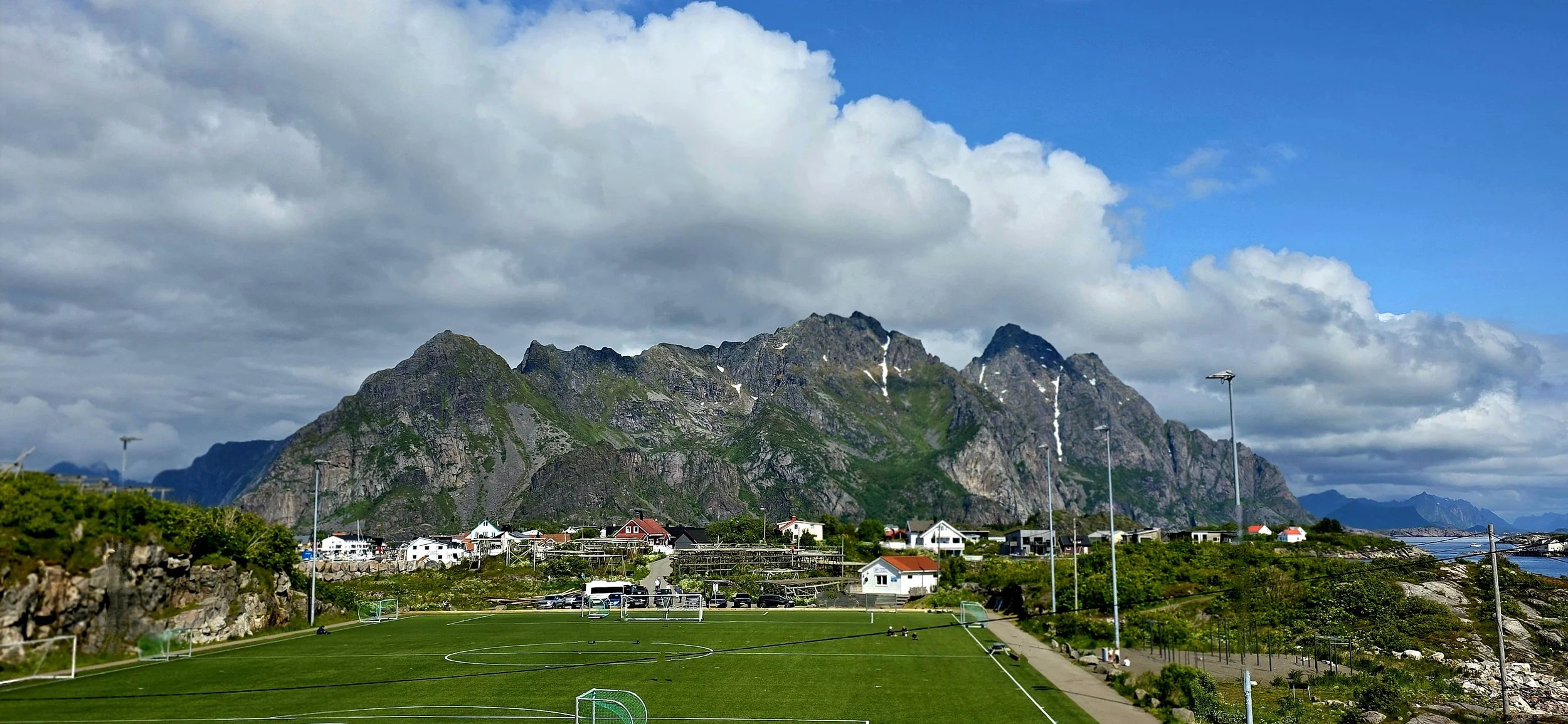 Additionally, Henningsvaer is famous for its’ soccer stadium which is most photogenic in the morning or at night. It is known for its stunning natural surroundings, framed by jagged mountains, the Arctic Ocean, and traditional fish-drying racks. It hosts amateur games for the local community and has become a popular destination for tourists and photographers. You can visit the stadium 24-7 and there is no fee to enter. In order to find this photo location, you need to hike around the stadium and then climb a few rocky boulders. However, it’s virtually impossible to get the iconic photo (visible online) without the use of a drone.